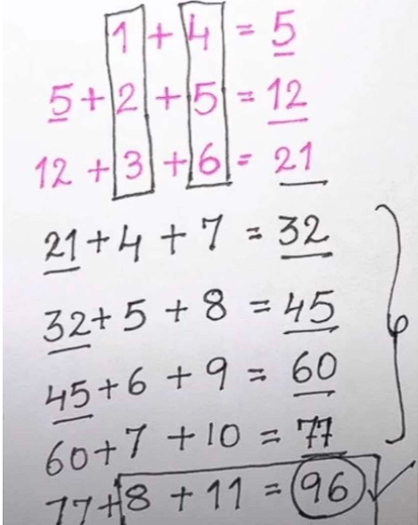 Går vi vidare har vi 2+2×5 som motsvarar 12, och så vidare. Följaktligen kommer talet 96 (8+8×11) i fråga.