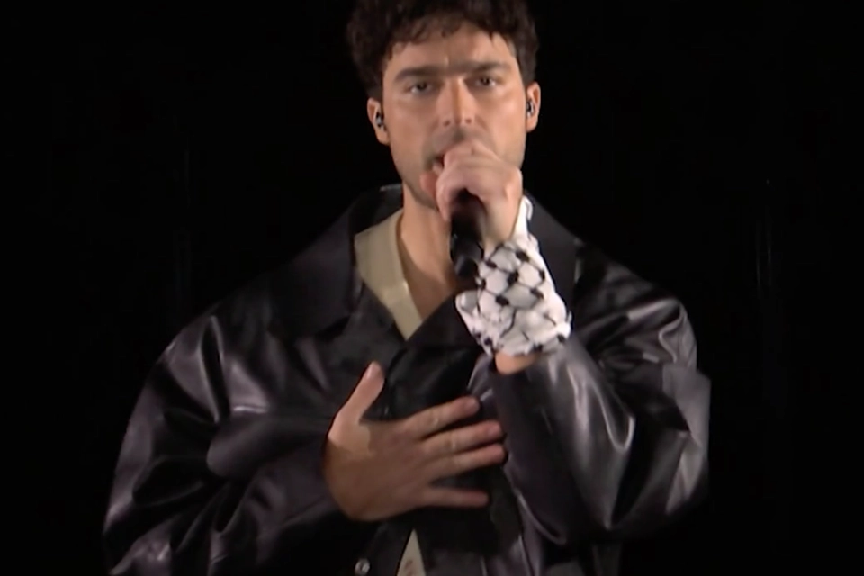 Eric Saade uppträdde under den första semifinalen av Eurovision Song Contest och bar då en palestinasjal virad runt handleden.