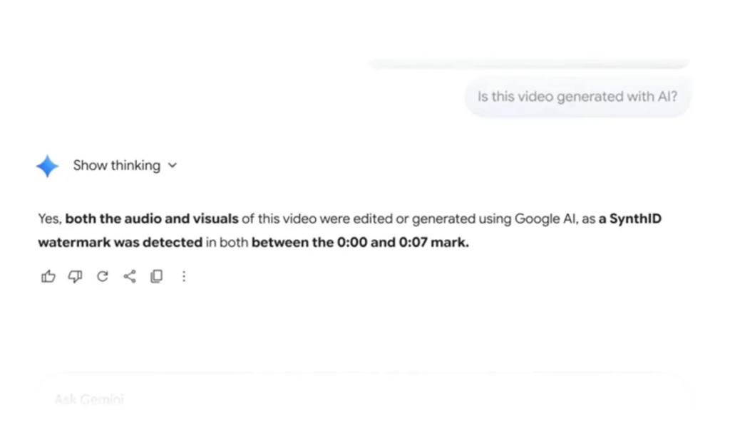 Om en vattenstämpel upptäcks markerar Gemini var den förekommer i videon eller ljudspåret och ger sammanhang i stället för ett enkelt ja-eller-nej-svar.